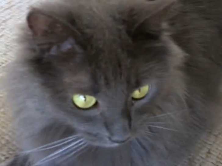 Cette vidéo montre un chat de race Nebelung qui est assis et souhaite jouer avec son propriétaire. En effet, le félin est calme mais montre à son maitre les fils avec lesquels il souhaite s'amuser.