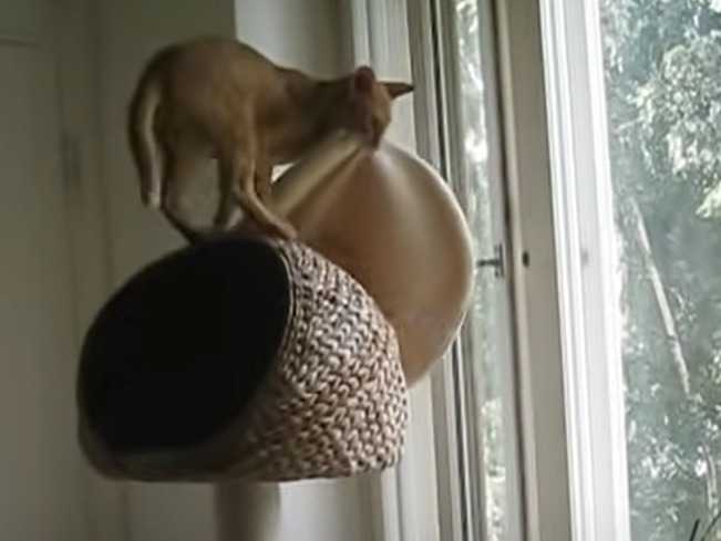 Cette vidéo présente un chat Oriental Shorthair qui fait du ménage dans l'arbre à chat. En effet, le félin chahute avec le coussin de sa niche perchée. Il tente à plusieurs reprises, avec l'aide de ses pattes et de sa gueule, de déplacer le coussin à l'extérieur. Chose réussie, car à la fin de la vidéo, il se balade avec dans la gueule.