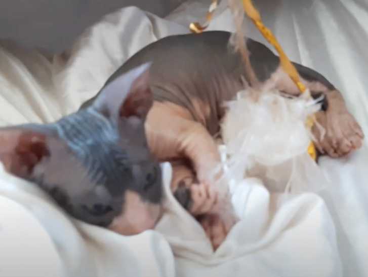 Le jeu fait partie intégrante du quotidien de certains félins qui peuvent s'avérer plus ou moins joueur en fonction de leur tempérament. C'est en effet le cas dans cette vidéo, avec un chaton de race Bambino. Le petit félin joue avec le plumeau qu'agite son maitre avec grand intérêt.