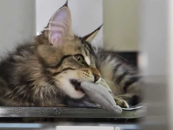 Cette vidéo montre un adorable chaton de race Maine Coon en train de jouer avec une peluche. En effet, le félin donne des coups de patte très vifs sur le jouet en forme de dauphin et le mordille avec intérêt.