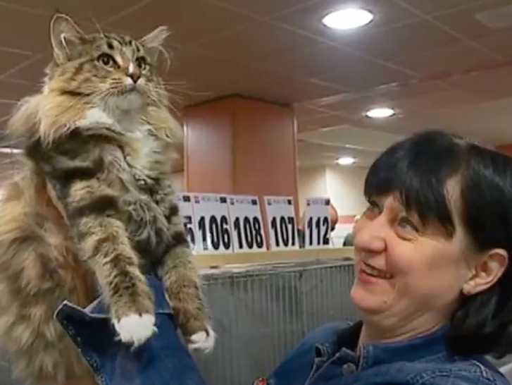 Cette vidéo montre une exposition féline internationale organisée à Aix-les-Bains, en Savoie. Un magnifique Maine Coon de 11 kilos est présenté à la compétition et en sort vainqueur !