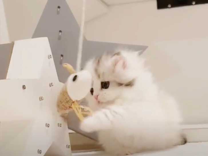 Cette vidéo montre un très jeune chaton de race Munchkin en train de jouer avec une peluche. En effet, le petit félin donne des coups de patte très vifs sur le jouet en forme de poisson. Ensuite, son propriétaire joue avec lui en agitant un bâton en plastique bleu.