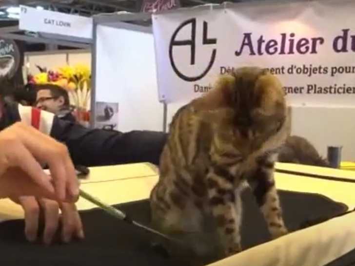 Cette vidéo montre des chats de races Maine Coon, Ragdoll et Bengal qui sont présentés lors d'une exposition féline qui se déroule à Paris. Grâce à leurs traits physiques exceptionnels, les félins sont observés par les visiteurs sous un oeil émerveillé.