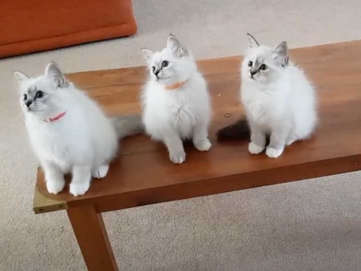 Cette vidéo montre des chatons de race Sacré de Birmanie à plusieurs moments de leur journée. En effet, les petits félins sont fraichement arrivés au sein de leur nouveau foyer et semblent s'y être acclimaté très vite. Ils s'amusent entre eux, jouent à divers jeux et mangent paisiblement. Ils ont même l'air de bien s'entendre avec leur nouvelle famille car, à la fin de la vidéo, ils se font câliner.