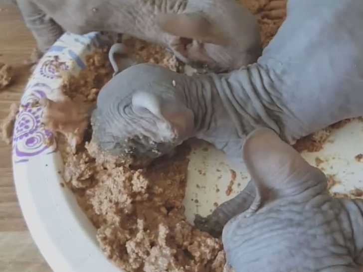 Cette vidéo montre une fratrie de chatons de race Elf-Cat en train de manger de la pâtée. Ils semblent se régaler du contenu de leur gamelle et avoir beaucoup d’appétit.
