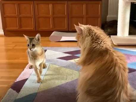 La cohabitation entre congénères peut parfois s'avérer taquine. C'est en effet le cas de ces chats Maine Coon et Chausie : ils se sautent dessus et se donnent des coups de pattes agressifs.