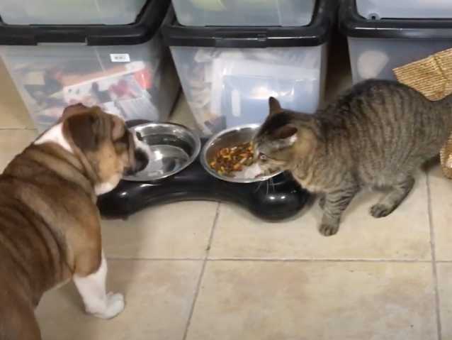 On dit parfois que les chats ont peur des chiens. Or, cette vidéo prouve que c'est loin d'être toujours le cas ! Elle montre en effet un chat Européen qui défend sa gamelle face à un chiot Bouledogue Anglais et ne se laisse pas impressionner, bien au contraire. Il semble intrigué par le chien qui, quant à lui, a plutôt l'air de se jouer de la situation...