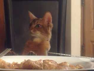 Un chat Somali s'installe sur la chaise de sa maîtresse au moment où celle-ci va passer à table. Il n'hésite pas alors à réclamer sa part avec des petits coups de pattes. Il est important de donner des limites à son chat dès le début si on ne veut pas qu'il recommence continuellement, à moins que cela ne plaise à ses maîtres.