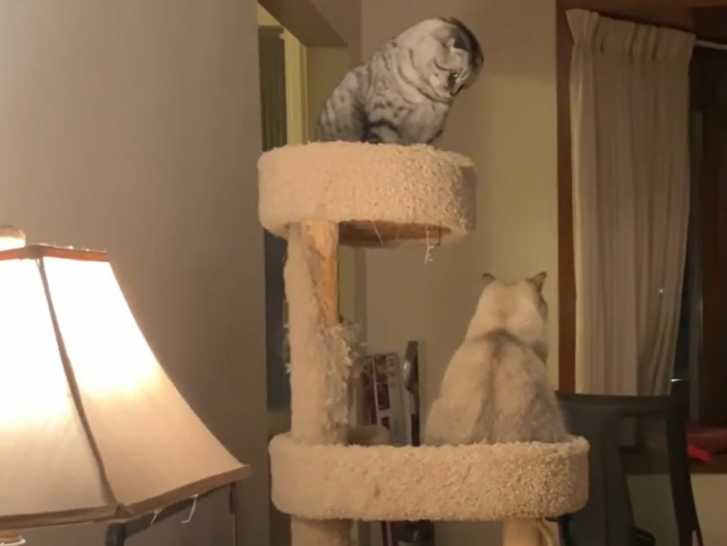 Cette vidéo montre deux chats British Shorthair qui semblent jouer de manière agressive. En effet, perchés au sein de l'arbre à chat, les deux félins ont les oreilles plaquées vers l'arrière pour montrer leur mécontentement. Un des deux chats finit par ne plus prendre en compte son congénère.