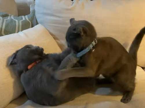 La cohabitation entre congénères peut parfois s'avérer électrique. C'est en effet le cas de ces chats Bleu Russe et British Shorthair : ils se sautent dessus, se mordent et se donnent des coups de patte agressifs.