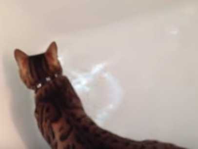 Un Safari se trouve dans la baignoire qui se remplit d'eau tandis que son compagnon observe de l'extérieur. Le premier a trouvé une bonne raison pour se mouiller les pattes puisqu'il y a deux petits poissons rouge dans l'eau qui font un excellent jeu. Le chat n'a pas l'air intéressé de manger le poisson mais ces petites bêtes qui bougent semble beaucoup l'amuser.