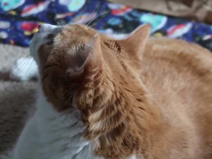 En général, lorsqu'un chat miaule, il adopte un ton assez aigu. Mais il lui arrive parfois d'émettre des sons rauques, comme celui dans cette vidéo. En général, ce type de miaulement trahit un sentiment négatif : de la colère, une douleur, un stress... D'ailleurs, lorsqu'il s'allonge sur le sol, ce chat agite la queue assez vivement, ce qui est généralement le signe d'une irritation. Difficile cela dit de savoir ce qui l'agace autant avec cette seule vidéo !