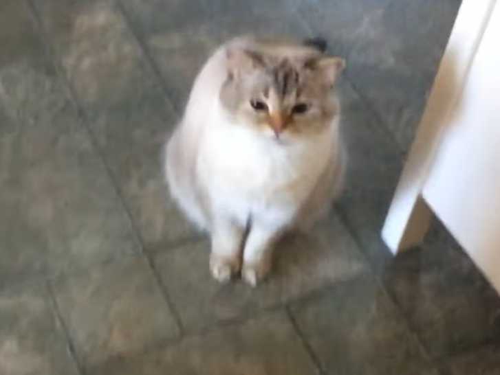 Cette vidéo montre un chat de race British Shorthair installé sur le sol. En effet, le félin réalise quelques petits miaulements en regardant son maitre pour communiquer avec lui.