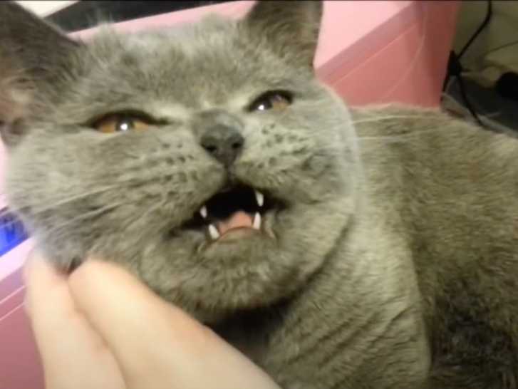 Cette vidéo montre un chat British Shorthair en train de miauler. En effet, le félin miaule pendant qu'il est câliné par son maitre.