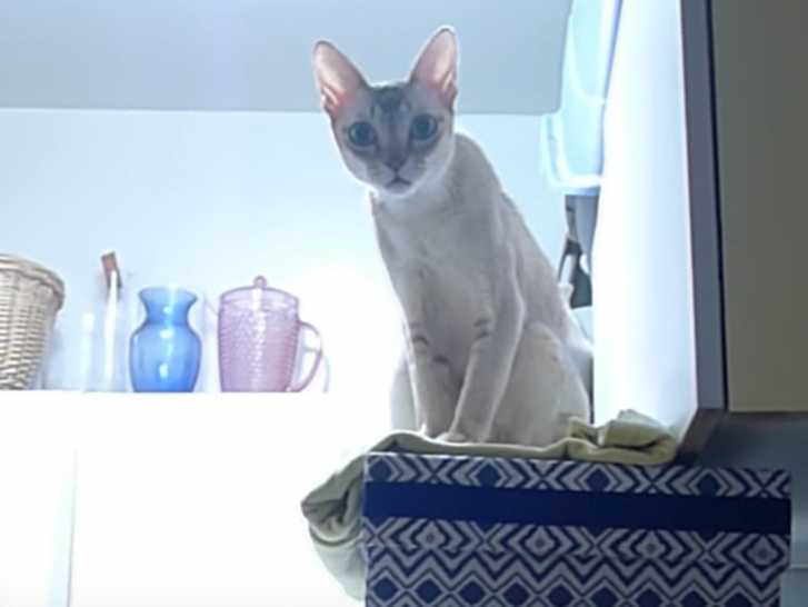 Cette vidéo montre un chat de race Singapura perché sur une boite en carton en haut du frigo. Le félin semble vouloir de l'attention de la part de son maitre car il finit par descendre de sa cachette pour se frotter à ce dernier.