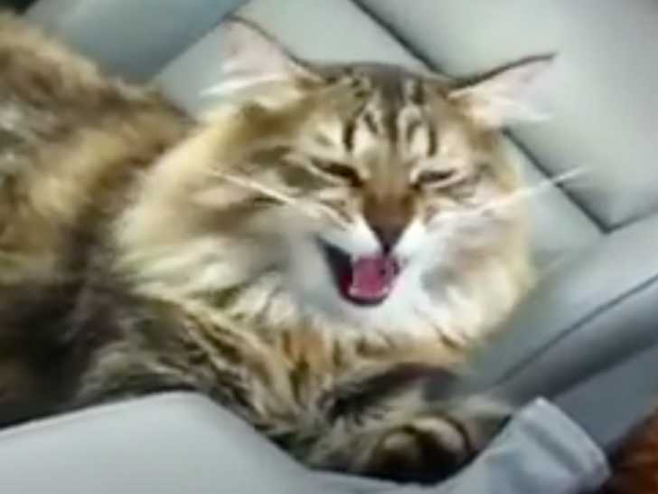 Cette vidéo montre un chat de race Sibérien qui est allongé à l'arrière d'une voiture. Ce dernier réalise quelques miaulements en regardant son maitre pour communiquer et interagir avec lui. A-t-il le mal des transports ?