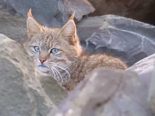 Voici un Chat de Biet surpris dans les rochers. Peut-être profite-t-il de leur chaleur pour se reposer un peu tout en restant attentif à son environnement ; il n'a d'ailleurs pas manqué de remarquer la présence du chasseur d'images. On aperçoit très bien les pinceaux de poils caractéristiques qui surmontent ses oreilles, et qu'on ne retrouve que chez quelques félins comme le lynx.