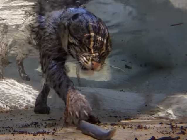 Des poissons ont été disposés au fond d'un bassin pour un Chat Viverrin. Ce qui donne l'occasion de quelques vues sous l'eau de celui-ci attrapant sa nourriture. Il mérite bien son autre nom de "Chat Pêcheur" en montrant qu'il ne craint absolument pas de mouiller son pelage. On peut le voir plus tard jouer avec la caméra.