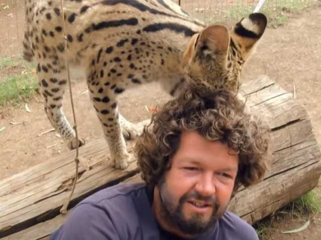 Le Serval montré ici semble adorer le contact avec les cheveux du cameraman. Ce dernier n'est visiblement pas sur un lit de roses, il se pourrait que l'animal griffe ou tire quelque peu sur sa tignasse. Cela illustre bien à quel point ce félin est peu farouche et facile à domestiquer.