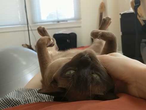 Cette vidéo montre un chat Burmese Americain qui se repose sur les genoux de son maitre et se fait câliner par ce dernier.