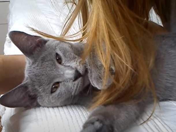 Cette vidéo montre un Chartreux en train de s'amuser avec les cheveux de sa propriétaire. En effet, le félin est blotti dans les bras de cette dernière et adore mâcher les mèches blondes de sa maitresse : il semble trouver cela amusant.