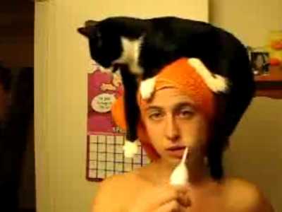 Ce chat noir et blanc a des habitudes un peu particulières puisque apparemment il adore se percher sur la tête de sa maîtresse pendant qu'elle se lave les dents. La jeune fille ne semble pas vraiment perturbée dans son rituel du matin, malgré ce poids sur la tête, question d'habitude sans doute !