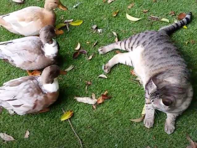 Cette vidéo montre un chat Australian Mist en train de jouer avec des canards. En effet, le félin est allongé à côté de ses compères à plumes. Il est très apaisé et semble plutôt ravi de leur présence : c'est une situation très improbable !
