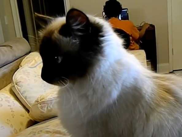 Le chat Balinais est connu pour être calme, très affectueux et ayant besoin de beaucoup d'attention de la part de ses propriétaires. Dans cette vidéo, le félin se repose dans un premier temps à côté de la fenêtre, puis dans un second temps, il cherche à obtenir des câlins de son maitre grâce à des petits miaulements.