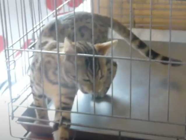 Cette vidéo montre un chat de race Bengal en train de miauler. En effet, le félin est enfermé dans une cage avec des grilles aérées et souhaite, à priori, en sortir.