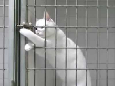 Ce chat fait preuve de beaucoup d'intelligence et de concentration pour réaliser un véritable tour de magicien. Après plusieurs tentatives, ce magnifique chat blanc finit en effet par trouver l'astuce pour ouvrir sa cage et s'en échapper en moins d'une minute... Le résultat de son intelligence ou d'un bon entraînement ? Peut-être un peu des deux !