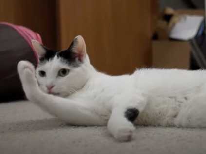 Le Bobtail Japonais est connu pour avoir un tempérament très affecteux, sociable et ayant besoin de beaucoup d'attention. Cette vidéo montre un félin de cette race qui se roule sur le tapis afin d'obtenir des caresses et de l'attention de son propriétaire.