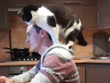 Un chat semble avoir envie de s'amuser avec son maître alors que ce dernier est en train de travailler devant son ordinateur. Pour attirer son attention, le chat n'hésite pas à lui monter sur les épaules et se frotter contre son visage jusqu'à ce qu'il lui accorde un peu de temps.