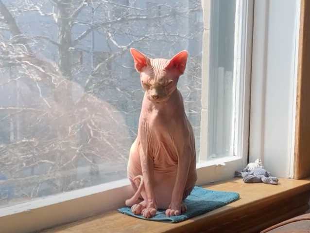 Cette vidéo montre un chat de race Donskoy en train de prendre le soleil. En effet, le félin qui est très mignon est assis à l'intérieur de la maison de ses propriétaires sur le rebord de la fenêtre et pique du nez. Il semble passer un moment très reposant !