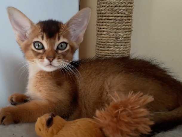 Ornys, un adorable chaton Abyssin, est installé confortablement sur l'arbre à chat avec en guise de copain, une peluche jaune. Cette race de chat est connue pour être très affectueuse : le petit félin ne déroge pas à la règle, en effet, il a l'air d'adorer les câlins réalisés par sa propriétaire.