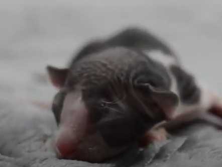 Ce chaton de seulement quelques heures de race Elf-Cat a encore les yeux fermés. En effet, le petit être est positionné sur une couverture et tente timidement de se déplacer.