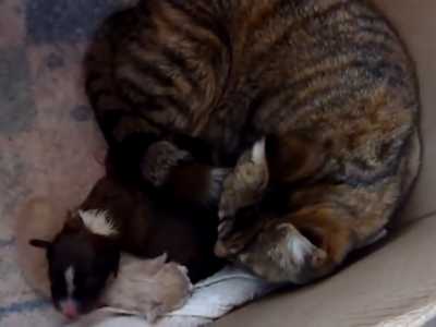Une famille a recueilli un chiot pitbull abandonné et le présente à leur chatte, qui a récemment accouché de deux chatons. Contre toute attente, cette adorable maman adopte le petit pitbull et le laisser téter parmi ses bébés. Comme quoi les animaux peuvent faire preuve d'un grand coeur, quelle que soir leur espèce !