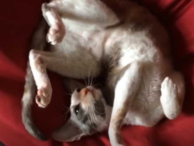 Âmes sensibles, cette vidéo est pour vous ! Un chat de race Cornish Rex est allongé sur le lit et réclame des câlins. En effet, le félin est positionné sur le dos, les quatre pattes vers le ciel et attend que son propriétaire lui donne de l'attention via des caresses : un vrai moment de tendresse !