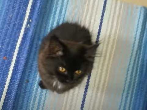Cette vidéo montre un chat de race Cymric, assis sur le sol en train d'attendre et de miauler. En effet, le petit félin de 14 semaines réclame de la nourriture : il semble très gourmand.