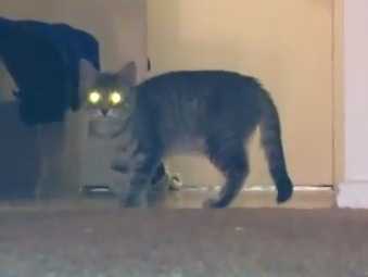 Les yeux des chats font penser, la nuit, à des lasers. Cette vidéo montre un chat de race Aphrodite qui est filmé lorsque le soleil est couché. Dès lors, ces yeux ressortent tels deux billes lumineuses. Un fantôme serait-il de la partie en cette soirée ? Mystère...