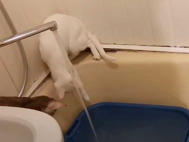 Malgré les idées reçues, certains félins adorent l'eau et plus particulièrement jouer avec. Cette vidéo montre des chats Oriental Shorthair en train de s'amuser dans une baignoire. En effet, les félins jouent avec l'eau qui coule du robinet dans la baignoire. Avec une complicité certaine entre les animaux, ils essaient de la boire tout en donnant des petits coups avec leurs pattes