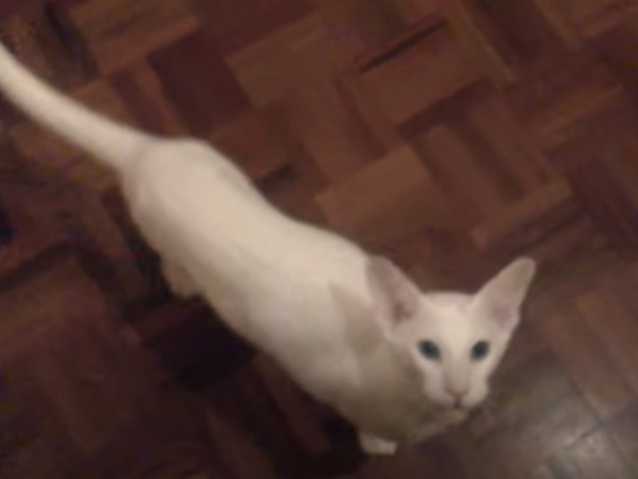 Cette vidéo montre un chat Foreign White en train de miauler. En effet, le félin regarde son maitre et miaule sans cesse avec insistance. Il semble vouloir quelque chose, comme de la nourriture...