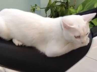 Ce Khao Manee a choisi un drôle d'endroit où se reposer, puisqu'il s'est allongé de tout son long sur le siège d'une moto. Confortablement installé, il n'a pas l'air décidé à laisser sa place.
