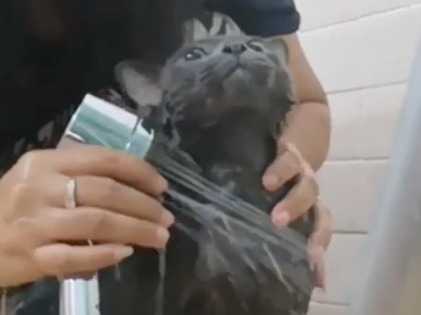 Le Korat est une race de nature calme et docile, mais ce n’est pas pour autant que le spécimen de la vidéo semble se laisser faire au moment de passer à la douche. Ainsi, la séance de nettoyage prévue par sa maîtresse s'avère périlleuse, car il tente désespérément de s’échapper de son calvaire. Il n’hésite d’ailleurs pas à exprimer son mécontentement par de longs miaulements.
