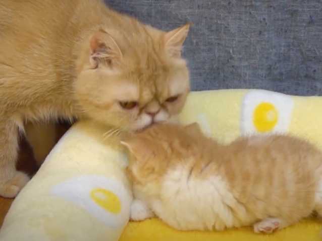 Cette vidéo montre une chatte Exotic Shorthair en train de prendre soin de son petit. En effet, la maman s'occupe de son chaton qui est installé sur un coussin qui semble très confortable. La chatte fait même la toilette à son petit.