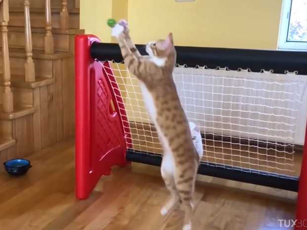 Il n'y a pas que les chiens qui adorent courir derrière un ballon : les chats aussi sont capables de jouer au foot. Ce beau matou roux tacheté fait par exemple un incroyable gardien de but et ne laisse passer aucune balle ! Pour ce faire, il s'étire, se met debout sur ses pattes arrière, fait des bonds prodigieux, se tortille dans tous les sens... La méthode est peu orthodoxe, mais efficace : aucune balle ne lui échappe !