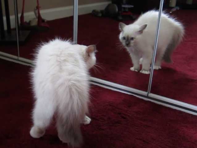 Cette vidéo montre un chaton Sacré de Birmanie en train de jouer avec son reflet dans le miroir. En effet, le petit félin est positionné devant un miroir, s'observe et court dans tous les sens face à son portrait. Il semble s'amuser comme un petit fou !