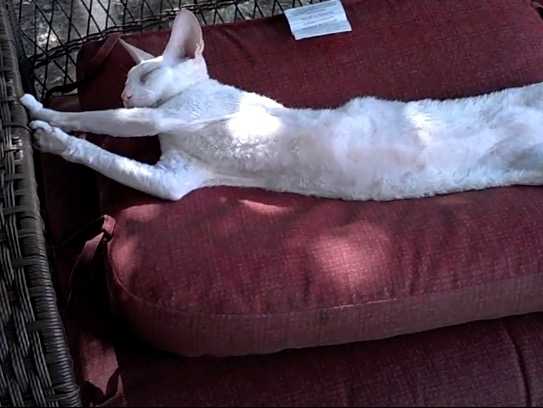 Connu pour son tempérament joueur et vif, le Cornish Rex reste malgré tout un félin et nécessite par conséquent de se reposer. En effet, dans cette vidéo, un chat Cornish Rex se détend et fait la sieste à l'ombre sur un coussin. Etendu de tout son long, ce félin a l'air d'apprécier fortement ce moment de repos.