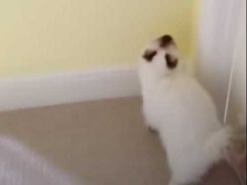 Cette vidéo montre un chat de race Sacré de Birmanie assis sur le sol en train d'attendre et de miauler auprès de son maitre.