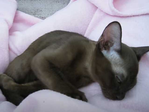Attention, une vidéo très mignonne est en approche ! Un chaton de race Burmese Americain est en train de faire la sieste sur les genoux de son propriétaire. Le petit félin semble faire une totale confiance en son maitre et se laisse caresser de manière très tendre.