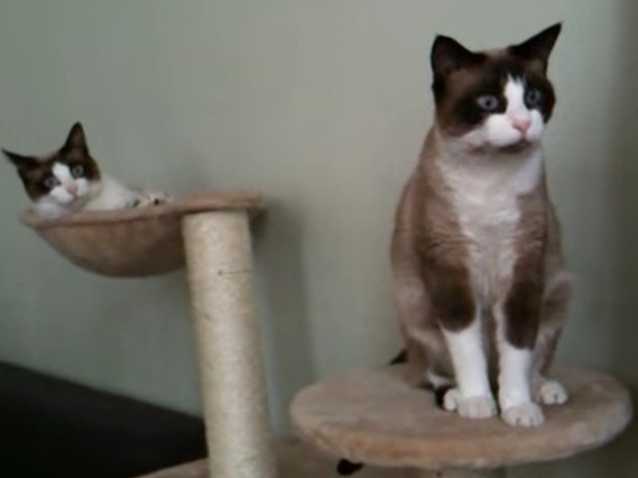 Deux Snowshoe se reposent sur leur arbre à chat quand tout à coup l'un d'eux se relève et reste fixer quelque chose. Il s'agit d'une vidéo de deux chats en train de converser que sa maîtresse a mis en route. Le chat a l'air réellement subjugué par la conversation des deux autres animaux.